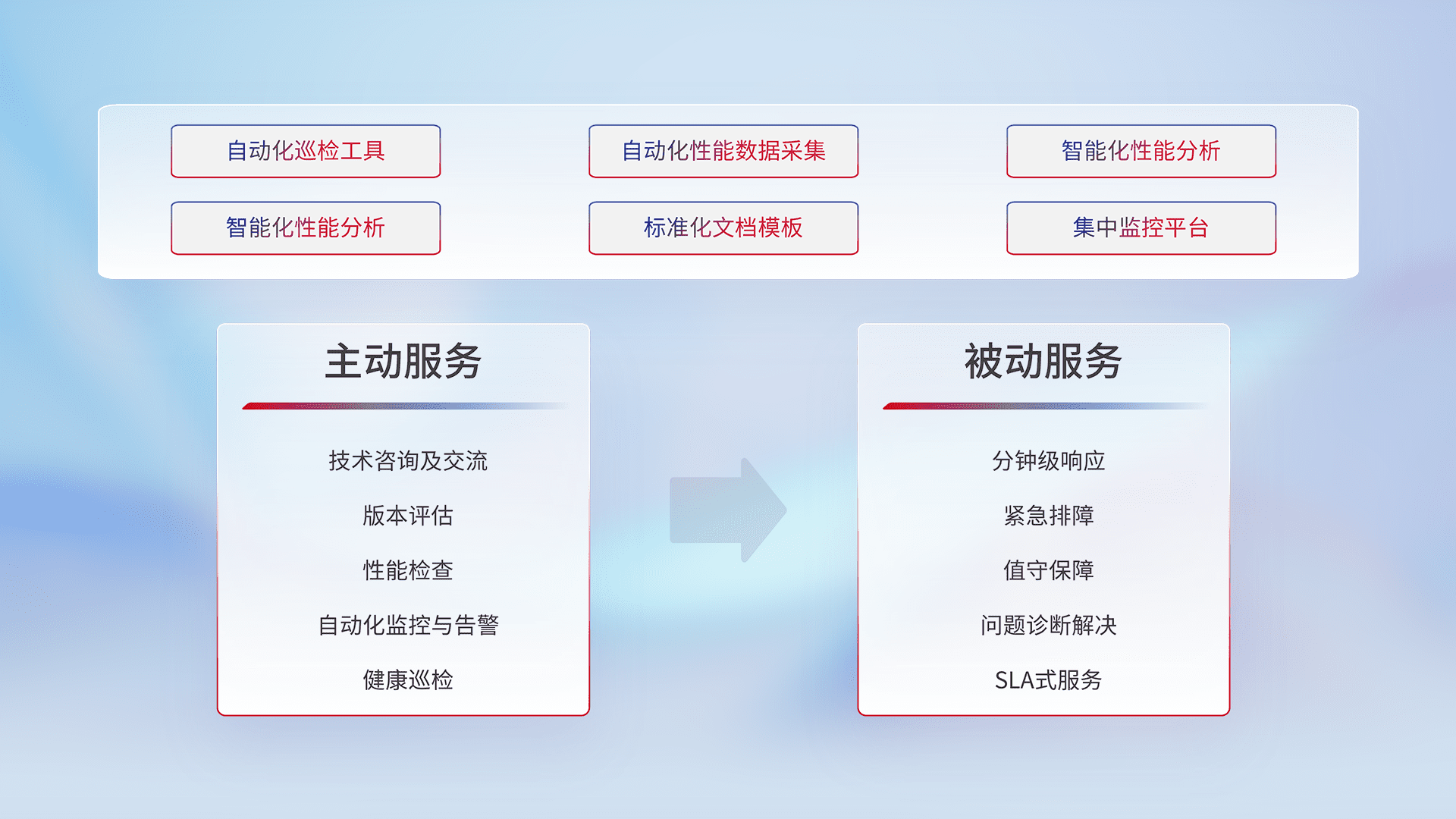 智能化工具和标准化文档,,保障服务质量,,提供主动服务(包含技术咨询、、版本评估、、、、性能检查、、自动化监控与告警、、健康巡检)和被动服务包含(分钟级响应、、紧急排障、、值守保障、、、问题诊断解决、、、SLA服务)。。。。