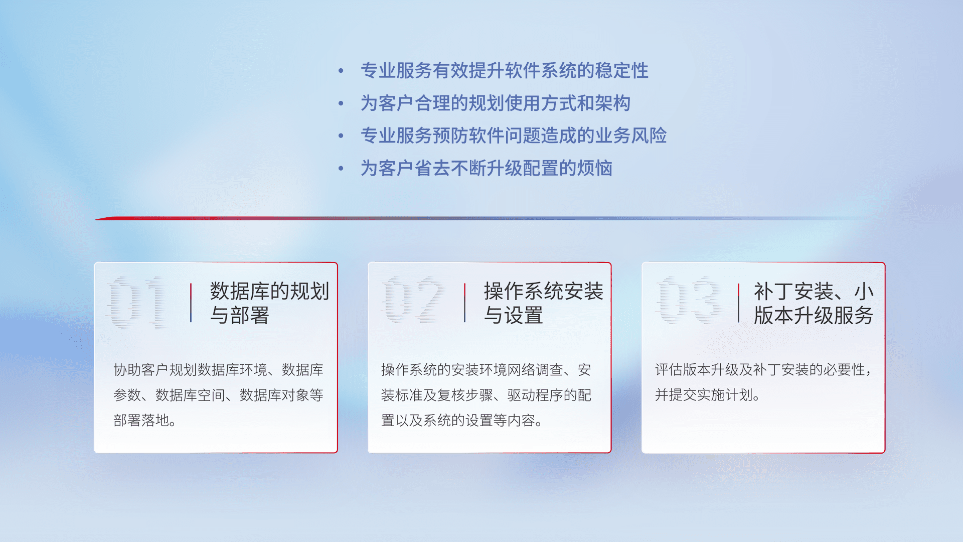 为客户提供软件规模升级、、、快速部署、、、、按需配置的专业服务,,,,从数据库的规划与部署到操作系统的安装与设置,,,再到补丁安装和小版本升级提供支持。。。。